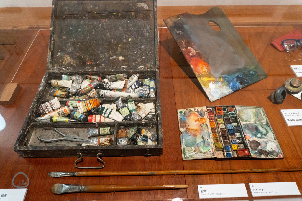 使い込んだ様子が分かる、絵の具やパレットなどの展示も。