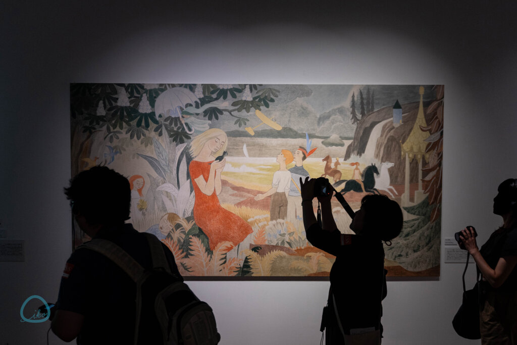 会場は大きく2つのエリアで分かれており、前半が油彩画や、トーベがとくに強いこだわりを見せた壁画のほか、ムーミン小説の初版本、風刺雑誌のバックナンバーなどが展示・紹介されていますが……