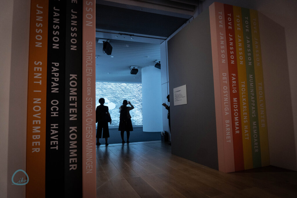 ムーミンの小説や挿絵の世界に来場者が入り込む”没入エリア”として、特別映像の上映ルームも。1回・3分45秒。書棚に並んだ小説の合間を抜けた先で展開されます!