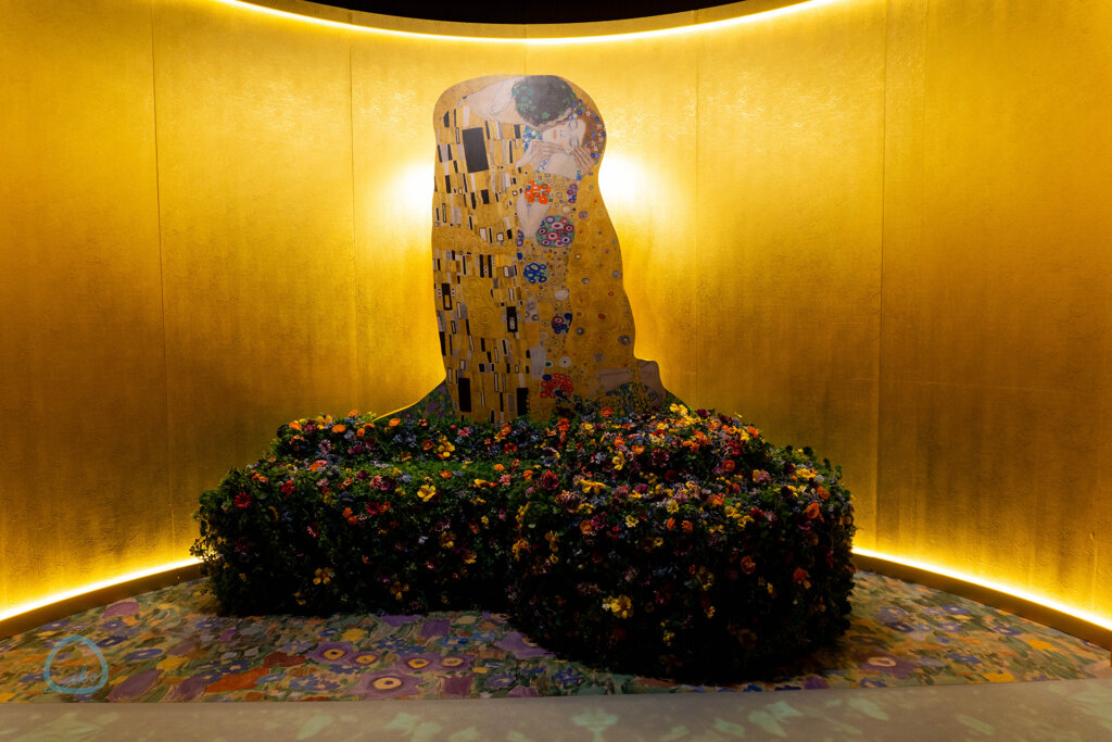 さらに奥へと進むと、《接吻(恋人たち)》の再現パネルが展開。パネル下部にある花壇部分はベンチとなっており、実際に座って写真が撮れるんです。