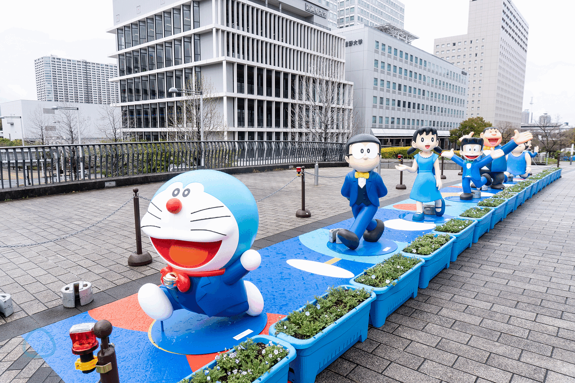 『TOKYO DREAM PARK』と「シンボルプロムナード公園」をつなぐ橋「つどい橋」の上には、フォーマルな装いのドラえもんたちが。この「100%ブルーカーペット」エリア(無料)のみ、ドラえもんに縛られることなく、藤子・F・不二雄先生が生み出した様々なキャラクターが登場します!