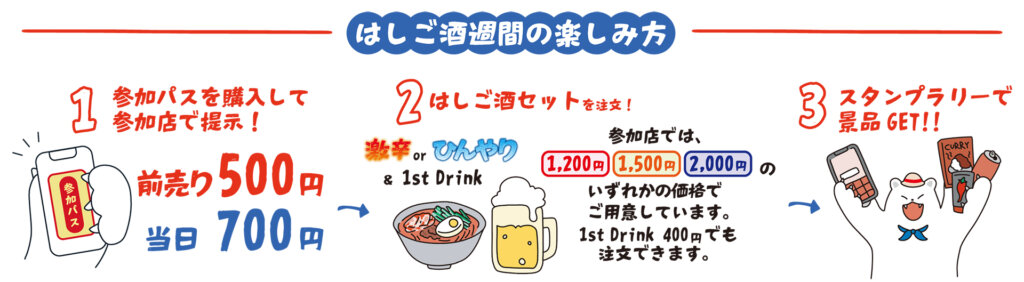 激辛グルメ、またはひんやりグルメと、駆けつけの1杯めのドリンクがセットとなった「はしご酒セット」をお得に楽しめます。