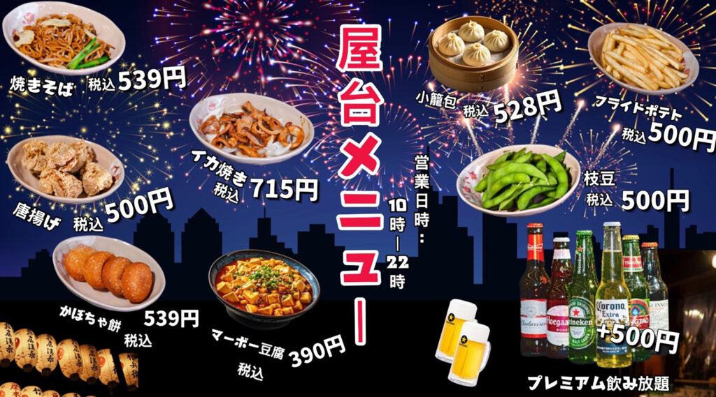 | 飲食料 | 【ビアガーデンコース】2980円〜 【串串香コース】4800円〜 *そのほか単品購入できる屋台メニューあり |
