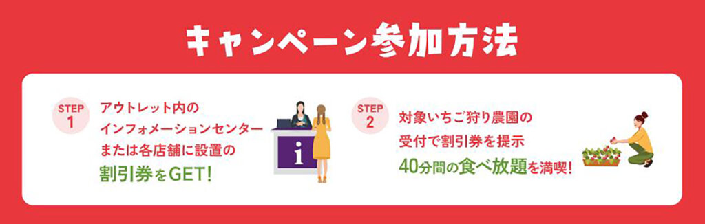 逆にアウトレットのインフォメーションセンターや店舗で入手できる割引券を、市内の対象いちご狩りスポットで提示するといちご狩りの料金が100円引きとなる、双方向の特典を実施中です。
