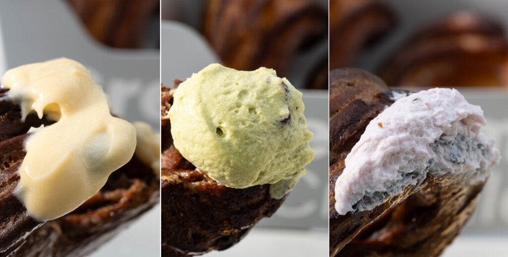 滑らかな口当たりにこだわったオプションのクリームは、「カスタード」「ピスタチオ」「フランボワーズ」の全3種類。