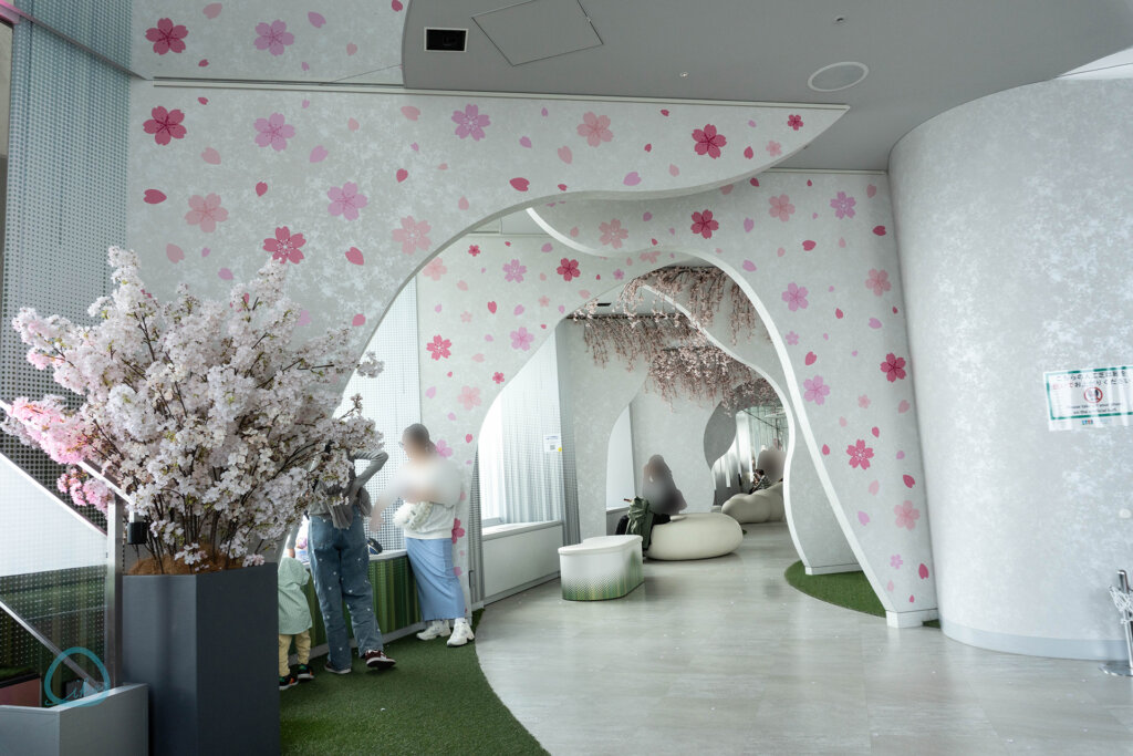 入館ゲートをくぐった脇にある施設看板も、いまだけのさくら仕様に。幼児用のプレイスポットになってました!