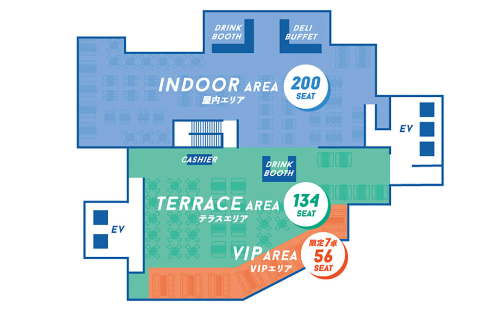 会場は3つのエリアで構成されており、テラスエリア:134席、屋内エリア:200席、VIPエリア*:56席で構成。