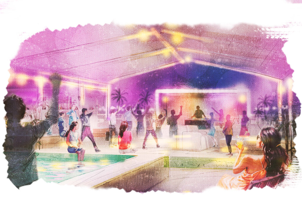 ライトアップやDJパフォーマンスなど、現地のナイトライフを愉しめる空間となっており、音楽やお酒を愉しめるカフェバーも用意されます。